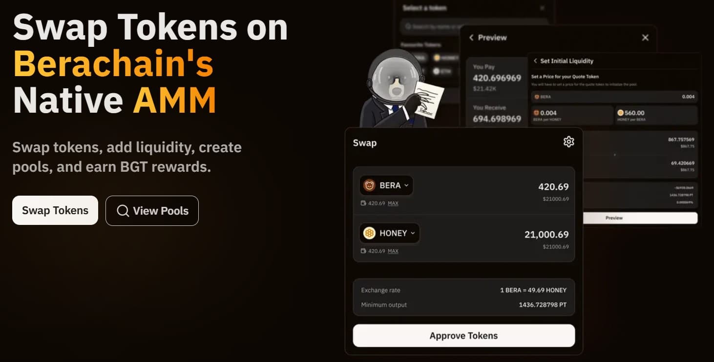 - Swap tokens, provide liquidity and earn rewards on the Berachain’s exchange BeraSwap.