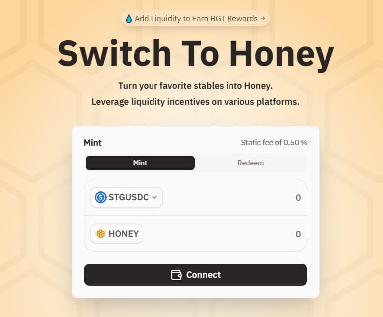 How is $HONEY created? It is minted by locking up other eligible crypto assets as collateral in special smart contracts known as "HONEY vaults." Every vault is built for a specific kind of collateral and, consequently, has its very own rules about minting and redemption, thereby ensuring $HONEY always represents real value.