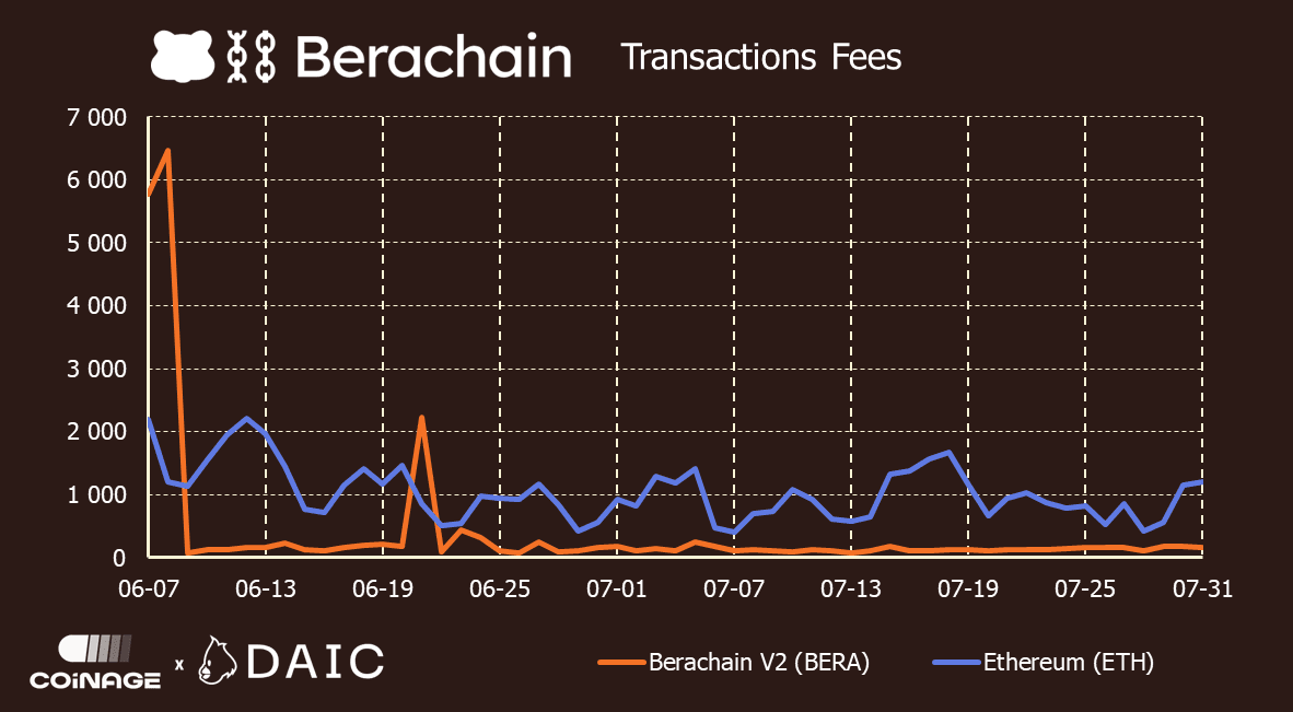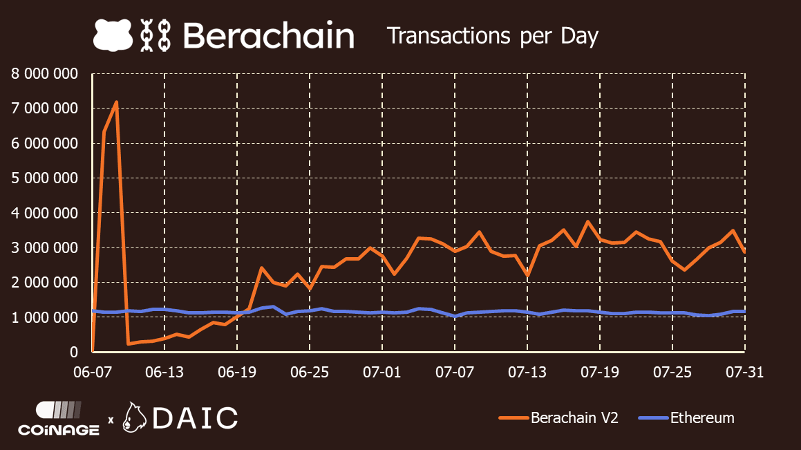 Since the launch of the testnet, Berachain has recorded over 137 million transactions as of July 31st. The network has been processing an impressive 2.5 million transactions per day during June and July. To put this into perspective, that’s a staggering 215% of the daily transaction volume of Ethereum over the same period. These numbers indicate that Berachain is capturing significant attention and usage from developers and users alike, making it one of the most active blockchain networks right now.