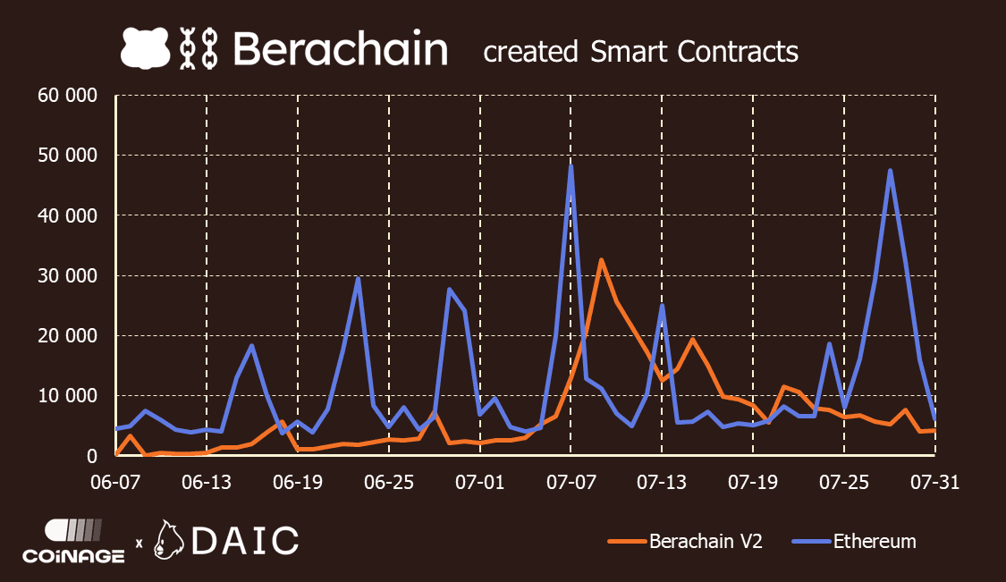 .Ethereum still holds the crown when it comes to smart contract deployments, with an average of 11,616 contracts deployed per day, totaling 638,925 contracts between June 6th and July 31st. However, Berachain is not far behind. During this period, a total of 374,947 smart contracts were deployed on Berachain, averaging 6,817 contracts per day. This figure demonstrates the robust development activity on Berachain, and with its lower costs and increasing traction, the gap between the two networks could close rapidly.