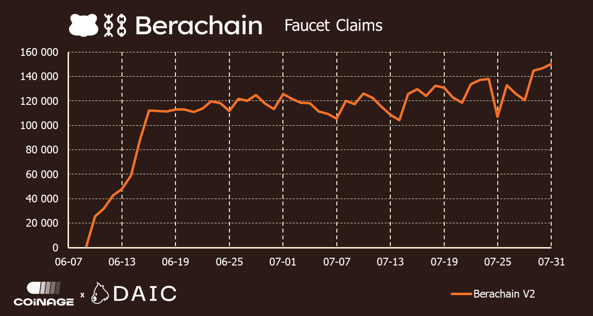 Berachain’s faucet, which distributes funds to users, has also seen remarkable activity. In July, there were 122,878 faucet claims per day on average, peaking at 150,156 faucet claims on July 31st. Since the genesis of the testnet, the faucet has been claimed 5,875,333 times. With this upward trend, it’s clear that more users are engaging with the network to access resources and start building on Berachain.