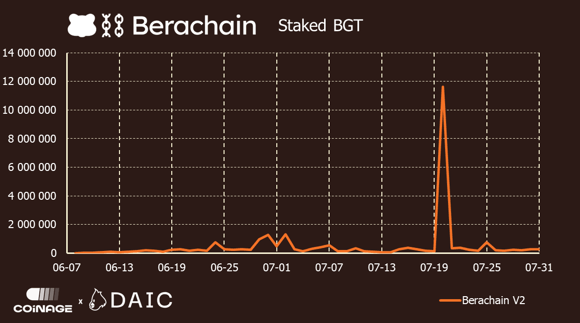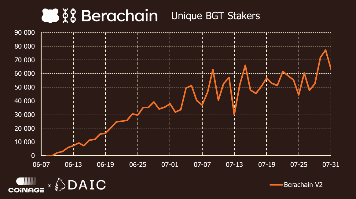 Accompanying the rise in staked $BGT, the number of unique $BGT stakers has also been increasing steadily. In July, the network saw an average of 50,727 unique accounts staking their $BGT tokens with validators daily. This expanding community of stakers reflects the growing belief in the value of $BGT and the sustainability of the Berachain network.