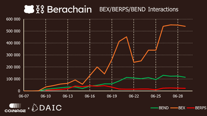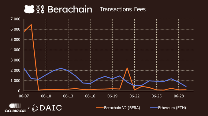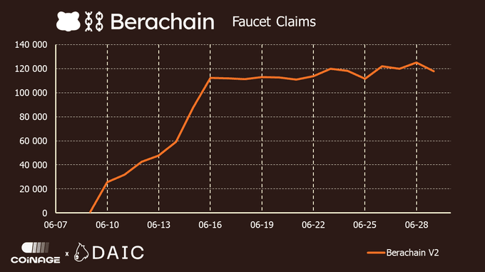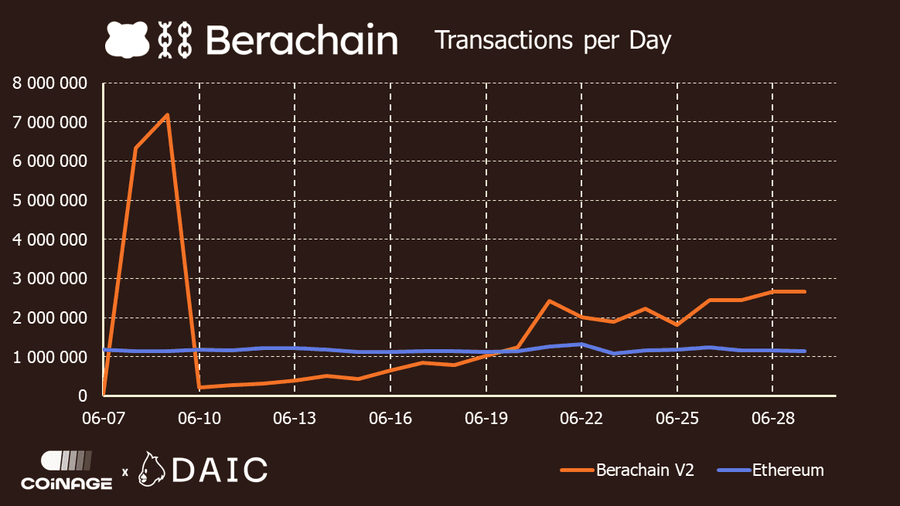Until the 29th of June more than 40.9 million transactions were performed on Berachain. Currently Berachain is doing ~2.6 million transactions per day! That's ~230% of Ethereum transactions per day!