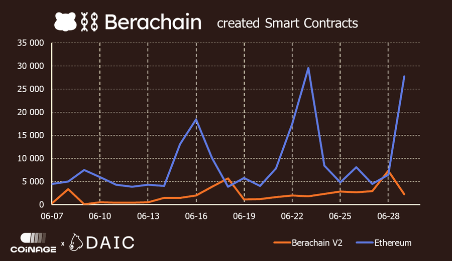 With more than 9,000 smart contracts deployed by day in average, Ethereum wins this comparison. But in total 47,270 smart contracts were deployed on Berachain already (~2,055 per day).