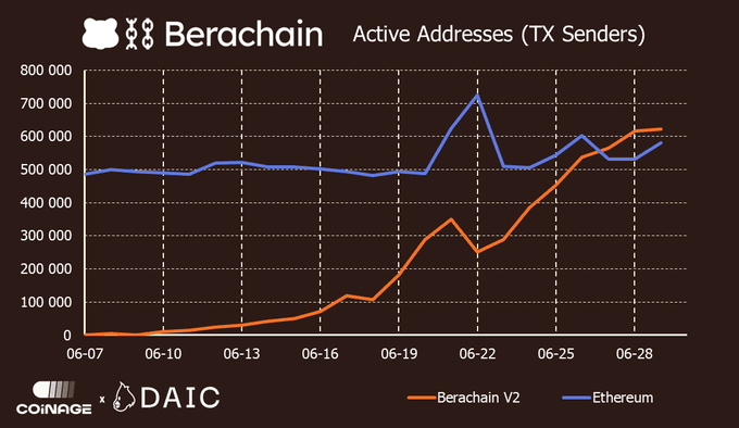 Berachain is currently used by more than 622,000 unique Accounts - compared to 581,000 on Ethereum.