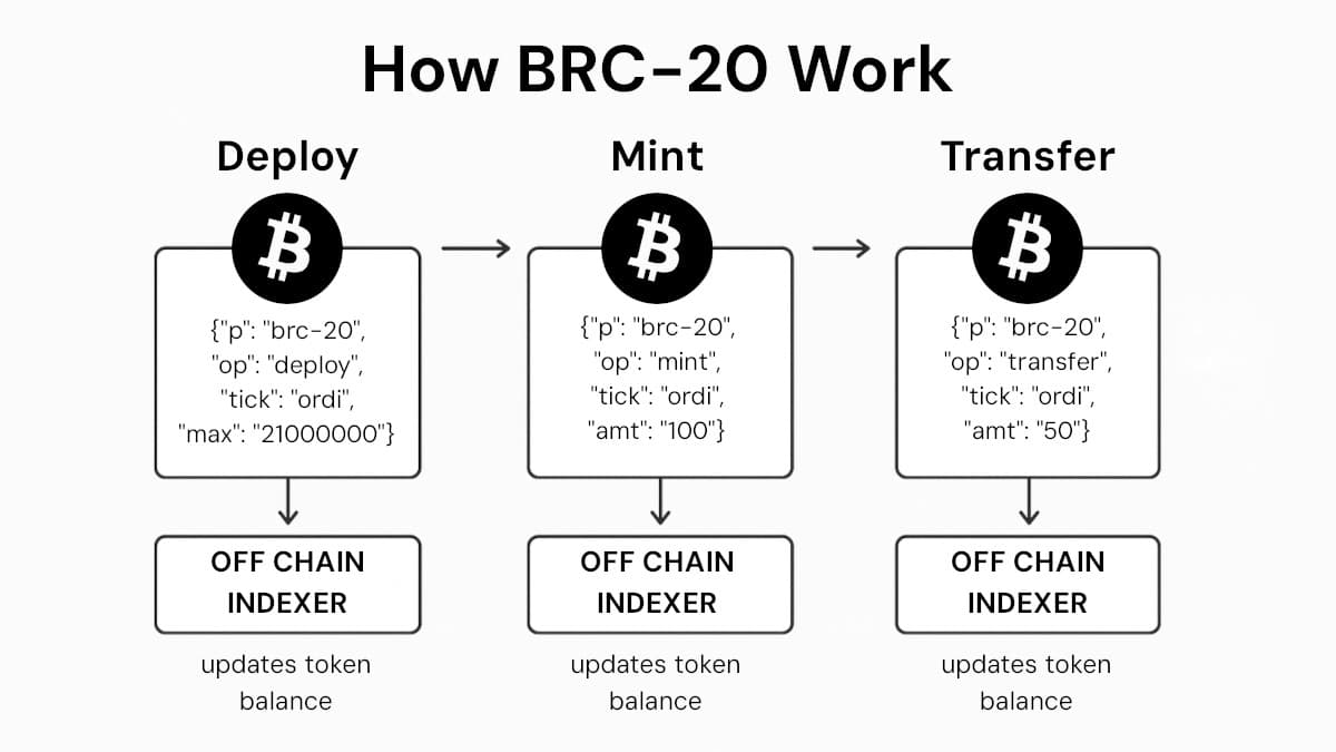 Because Bitcoin lacks a virtual machine to execute code, there is no smart contract enforcing these rules on-chain. Instead, BRC-20 wallets and marketplaces use indexers to read and interpret inscriptions, keeping track of token balances and valid transactions.