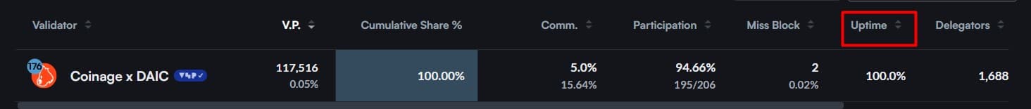 Look for validators maintaining uptimes close to 100%. High uptime is a sign of reliability and ensures your rewards are maximized with no penalties from missed blocks.