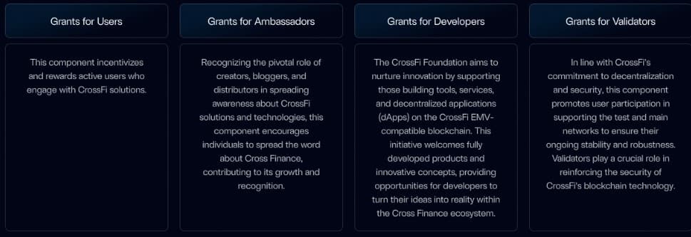 Recognizing the importance of community engagement and innovation, the CrossFi Foundation, a non-profit organization, plays a pivotal role in nurturing the growth and development of the ecosystem. Through initiatives such as developer grants and user-focused programs with total rewards of $50 millions, the Foundation actively fosters a vibrant community that contributes to the network's evolution. This includes allocating a significant portion of MPX tokens to early adopters who participate in the testnet and contribute to the network's improvement.
