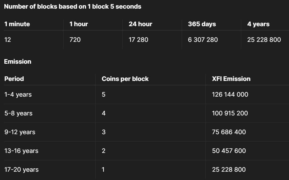 The emission of XFI coins is designed for 20 years and has 5 stages.