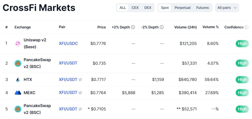 At the moment XFI is traded on exchanges like MEXC, HTX (Huobi) paired with USDT, as well as Uniswap and PancakeSwap.