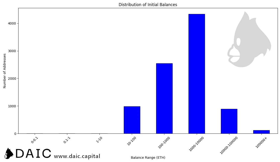 The bulk of the distribution was held in large wallets, with 121 wallets holding more than 100,000 ETH at genesis.
