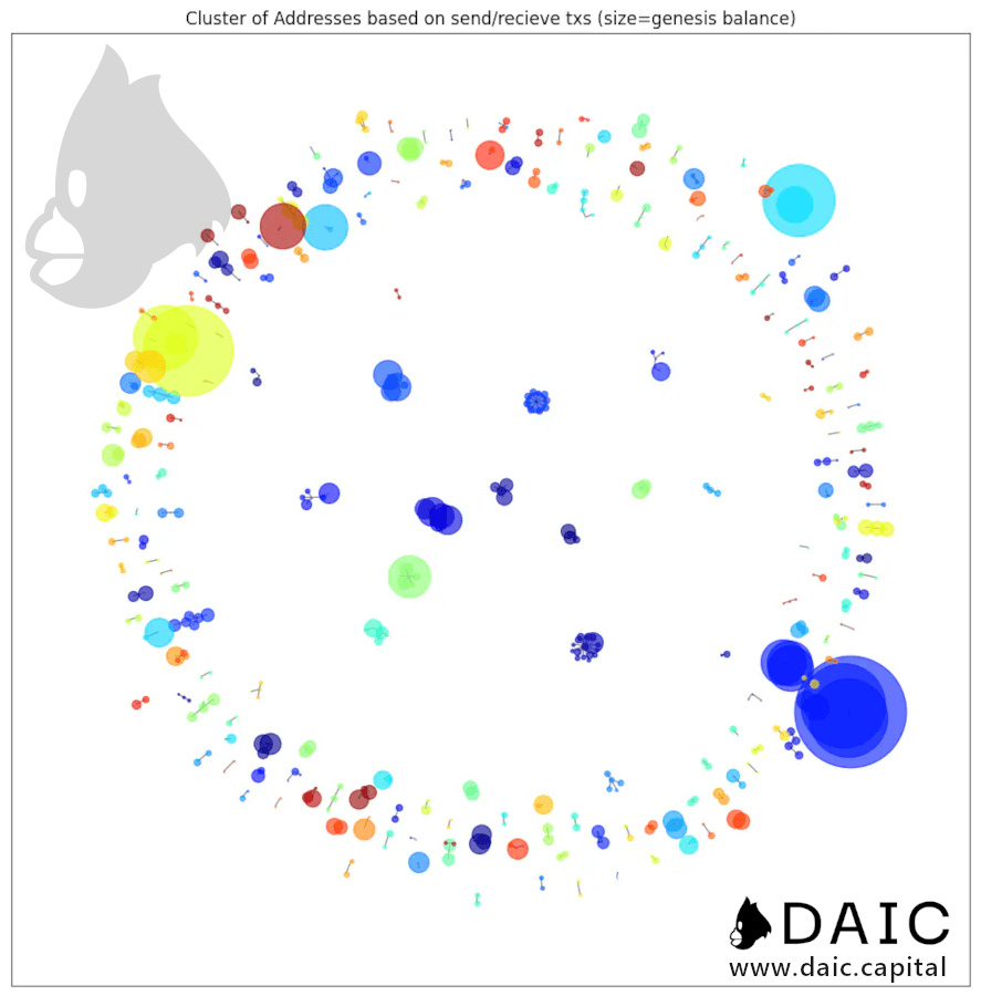 To gain a better understanding of the participants in the genesis event, we conducted a cluster analysis. This involved grouping addresses into clusters if they transacted with one another. By tracing interactions, we aimed to estimate how many unique users actually participated in the Ethereum genesis.