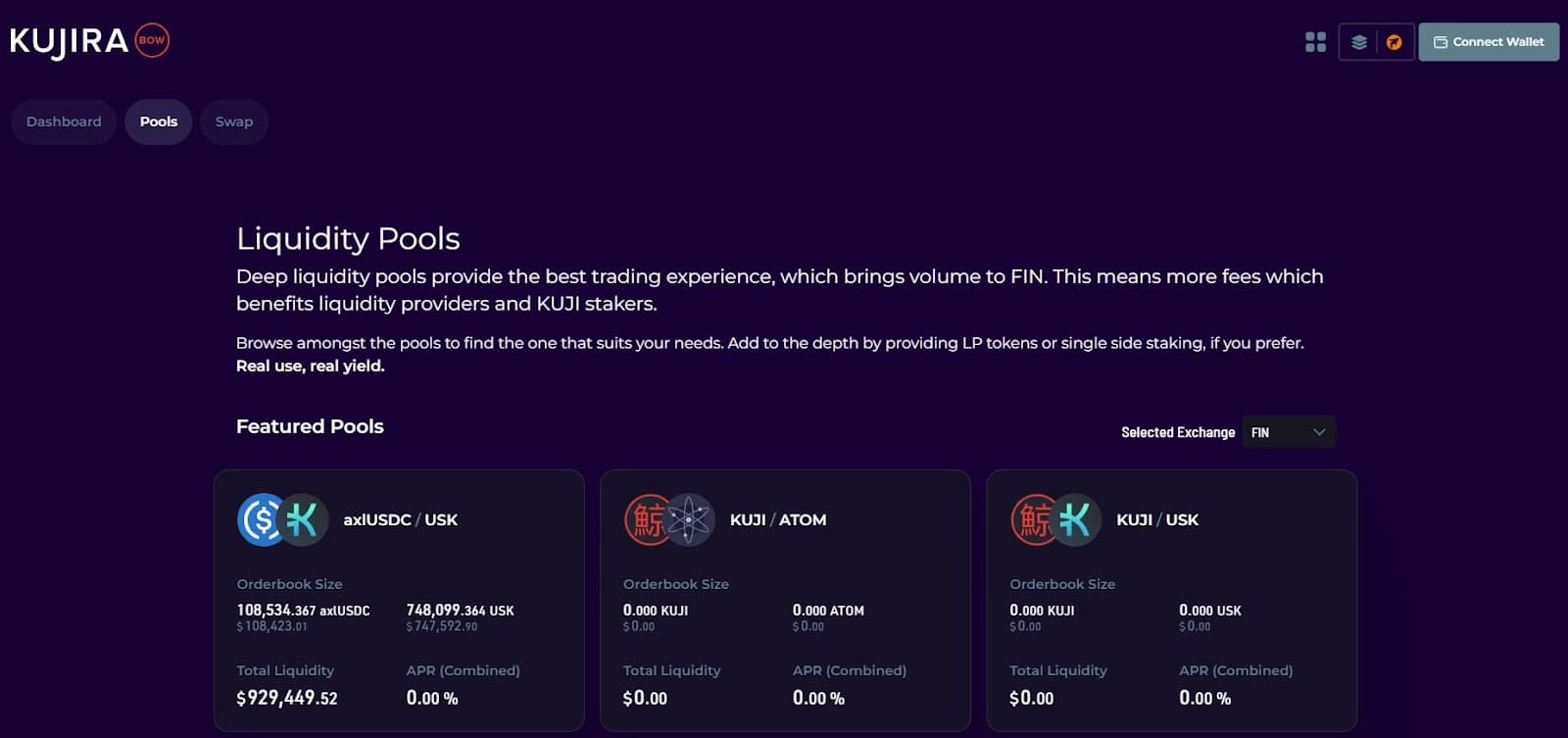 Making the most of the Cosmos infrastructure, FIN empowers users to seamlessly trade assets from diverse blockchains on a unified platform. Its user-friendly interface facilitates the placement of market or limit orders. To address potential situations of insufficient market liquidity affecting the trading experience, FIN integrates BOW, a dedicated platform designed to augment liquidity for the FIN exchange.