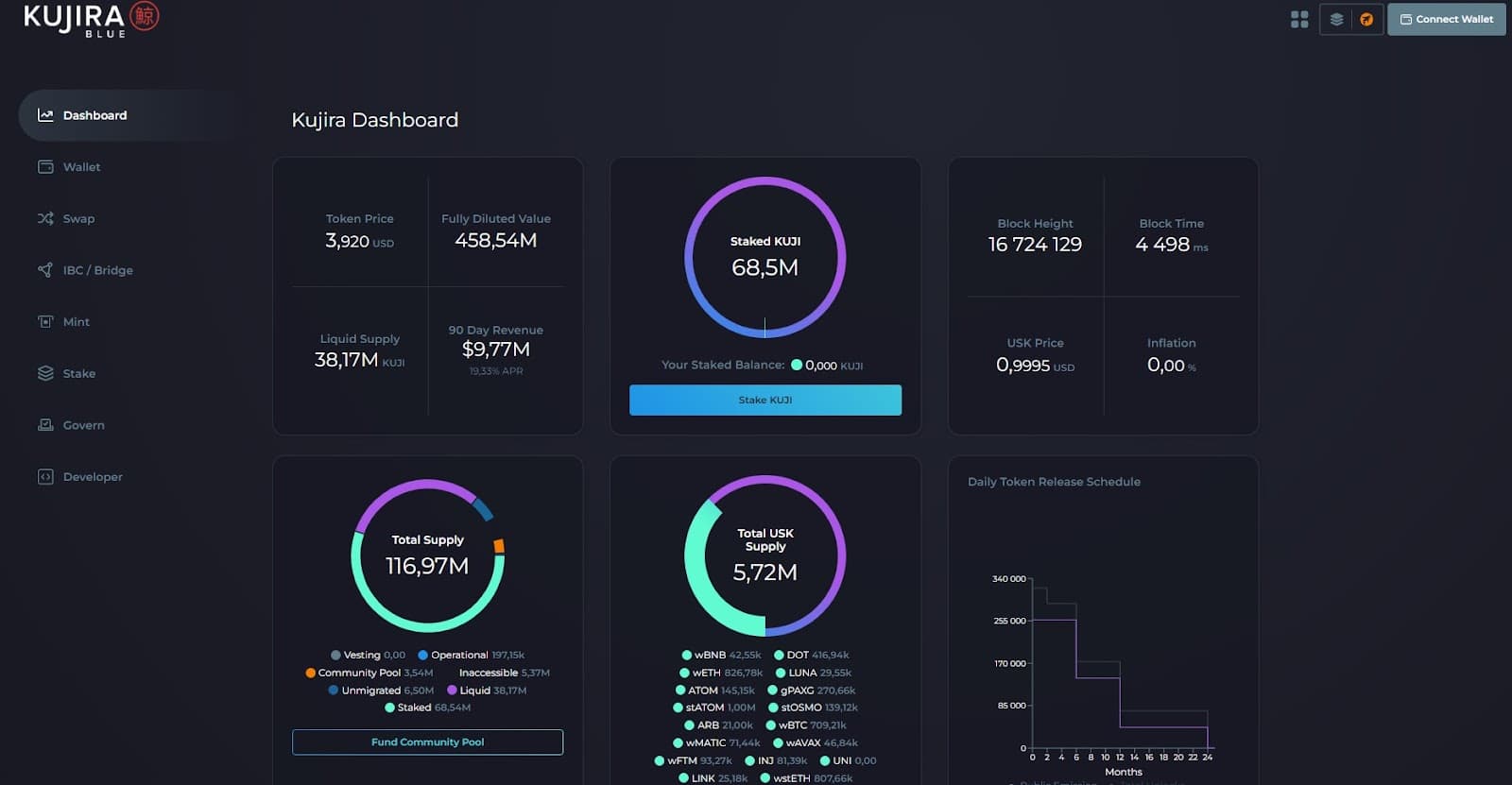 BLUE is the central hub of the Kujira ecosystem, bringing together functionality for staking, bonds, swaps, cross-chain transfers and asset management. Key analytical data from the Kujira blockchain is displayed on a comprehensive BLUE dashboard. This dashboard includes an interface to Cosmos IBC and a proprietary cross-chain bridge that enables asset transfers between different chains.