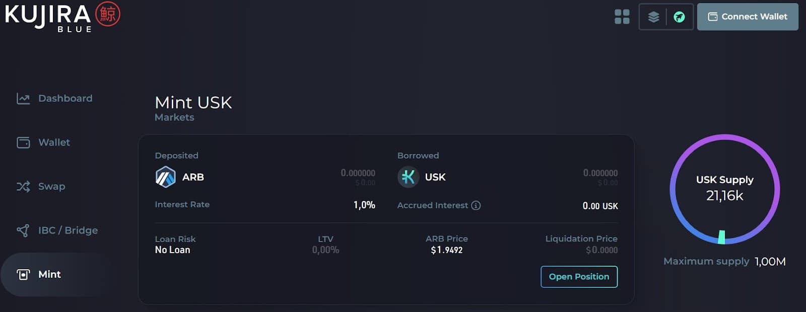 Importantly, BLUE also provides the ability for users to deposit collateral and mint the USK stablecoin.
