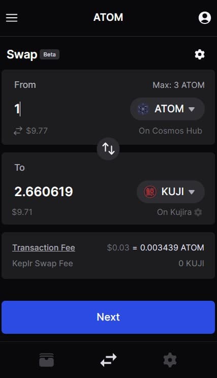 Step 3. From the list of tokens, select ATOM and KUJI and set the number of tokens you want to swap to KUJI. Press Next button.