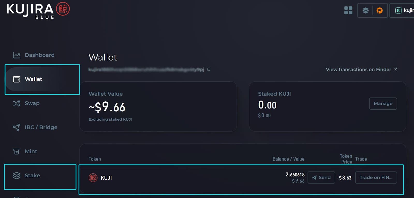 Step 5. Once your wallet is connected, you will see your KUJI token balance under the Wallet tab. Below you will see the Stake tab, press on it.