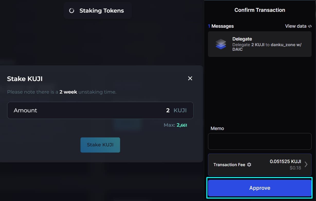 Step 8. Enter the number of KUJI tokens and confirm the transaction in your wallet by clicking Approve button. Please note there is a 2 week unstaking time.