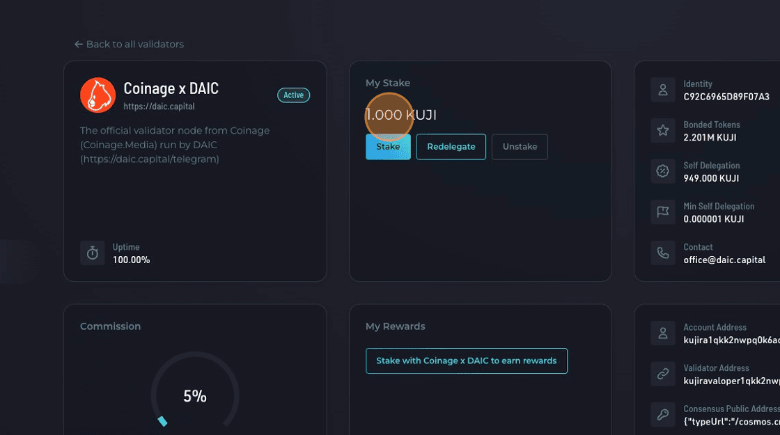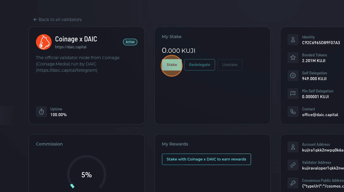 The return from staking KUJI varies based on the network's overall staking participation, real yield, and specific validator commission.