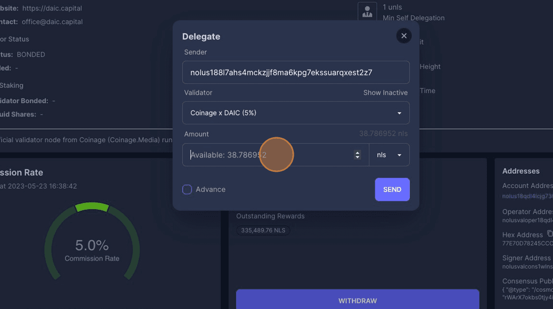 8. Click the Amount field, enter the number of NLS tokens you want to stake and Click Stake