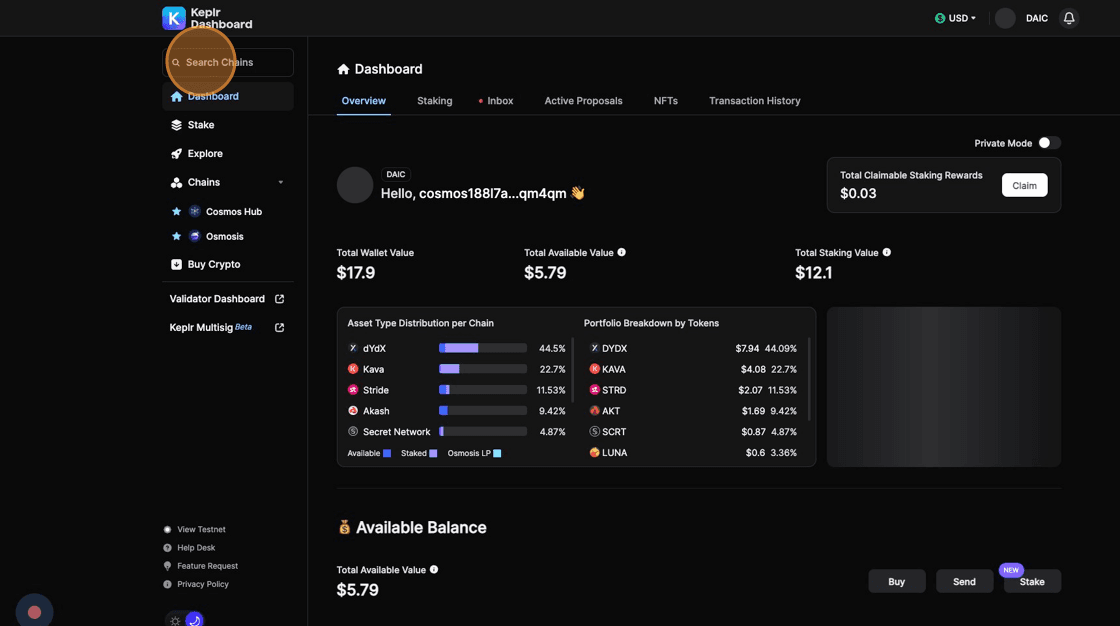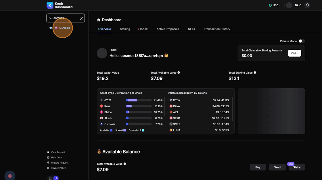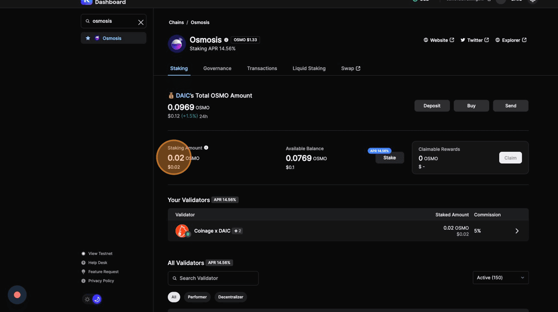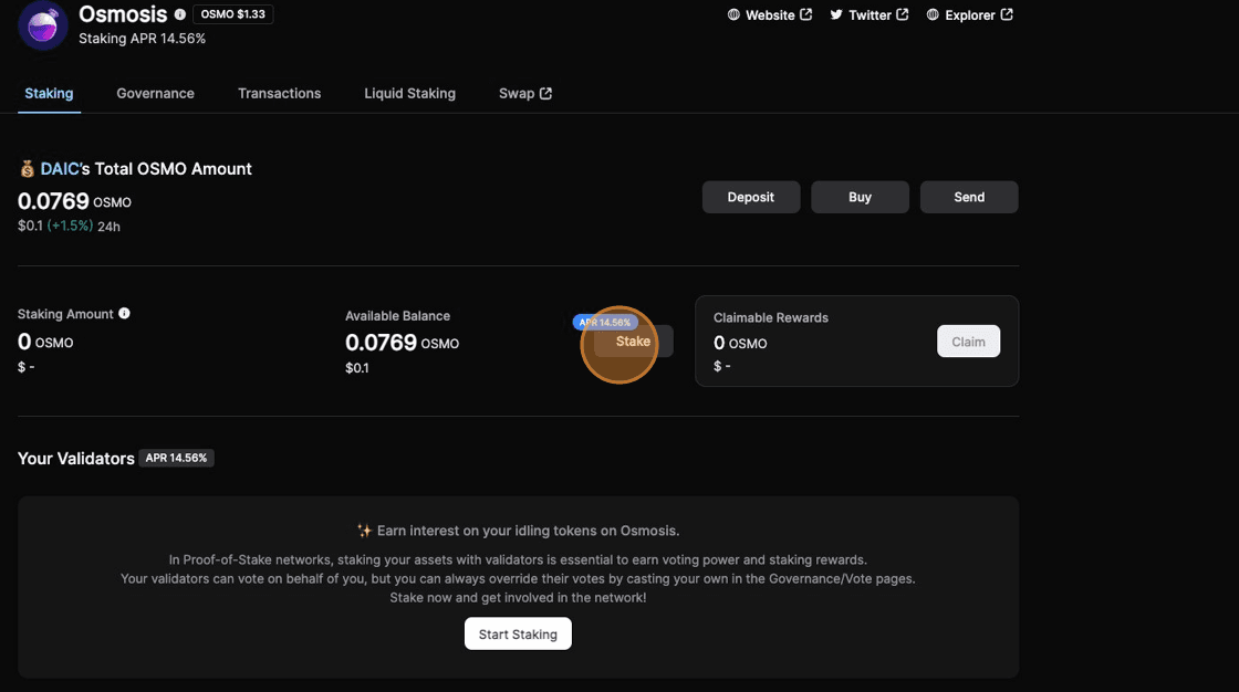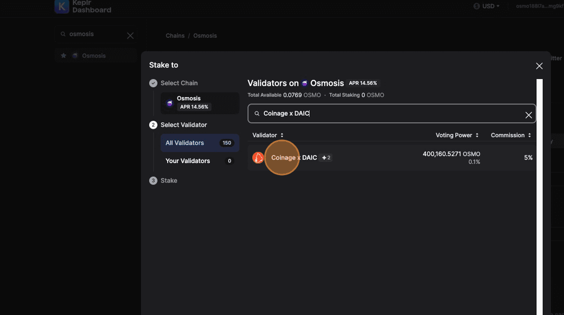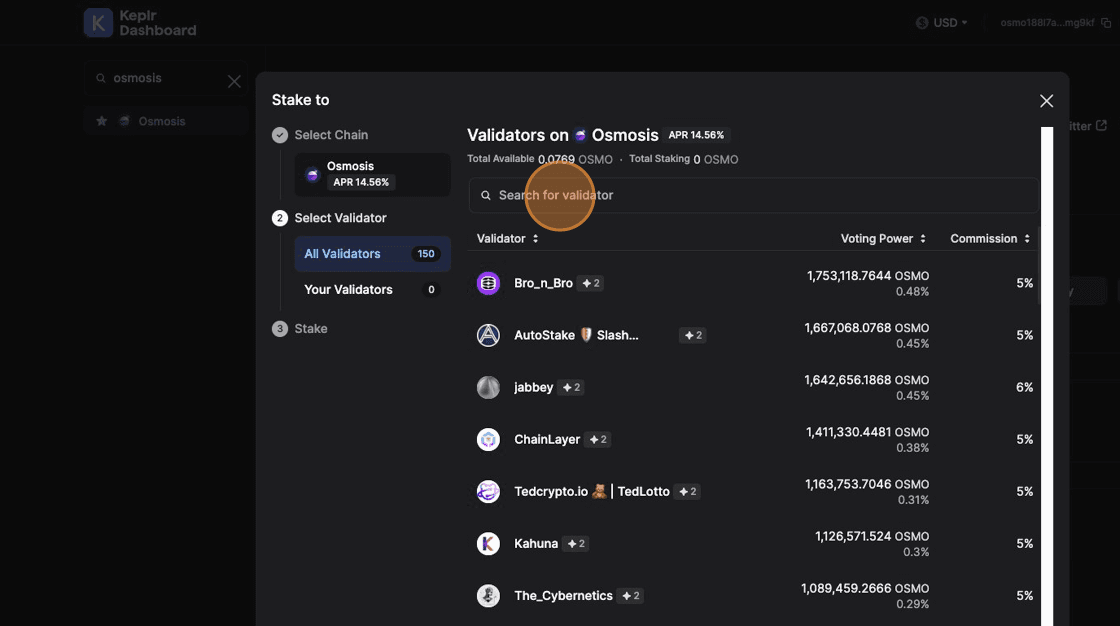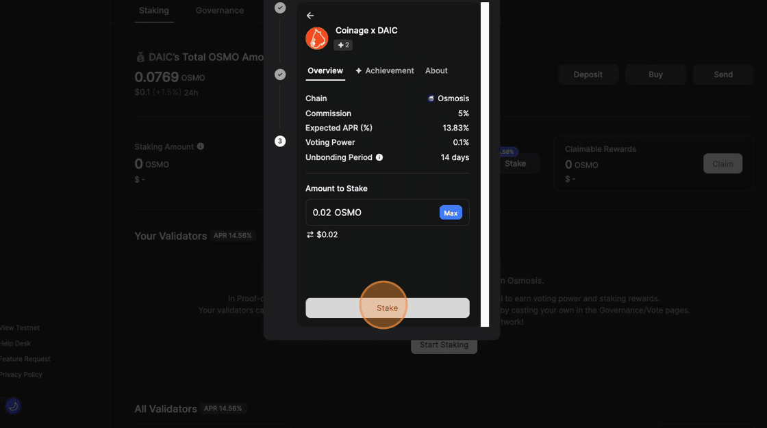 8. Click the Amount field, enter the number of OSMO tokens you want to stake