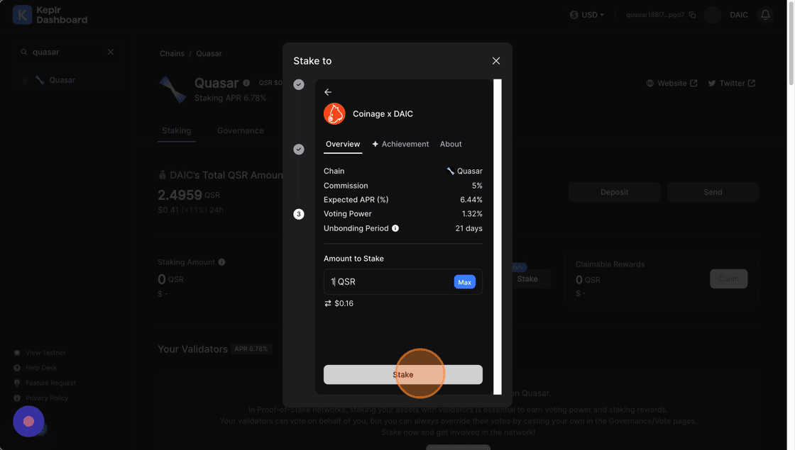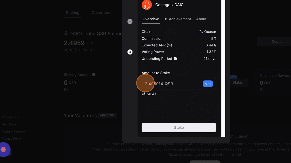 8. Click the Amount field and enter the number of QSR tokens you want to stake