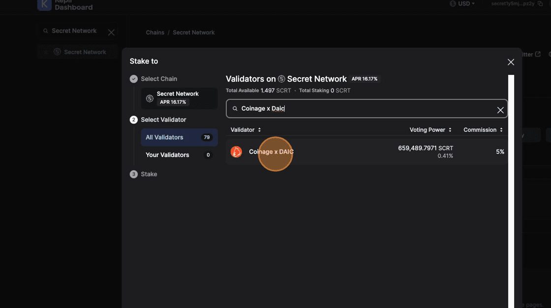 5. Click the Search for validator field and type Coinage x DAIC