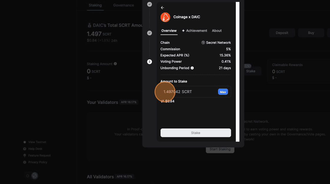 8. Click the Amount field, enter the number of SCRT tokens you want to stake