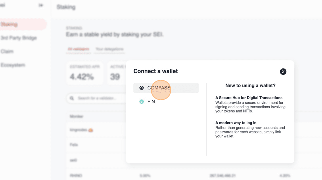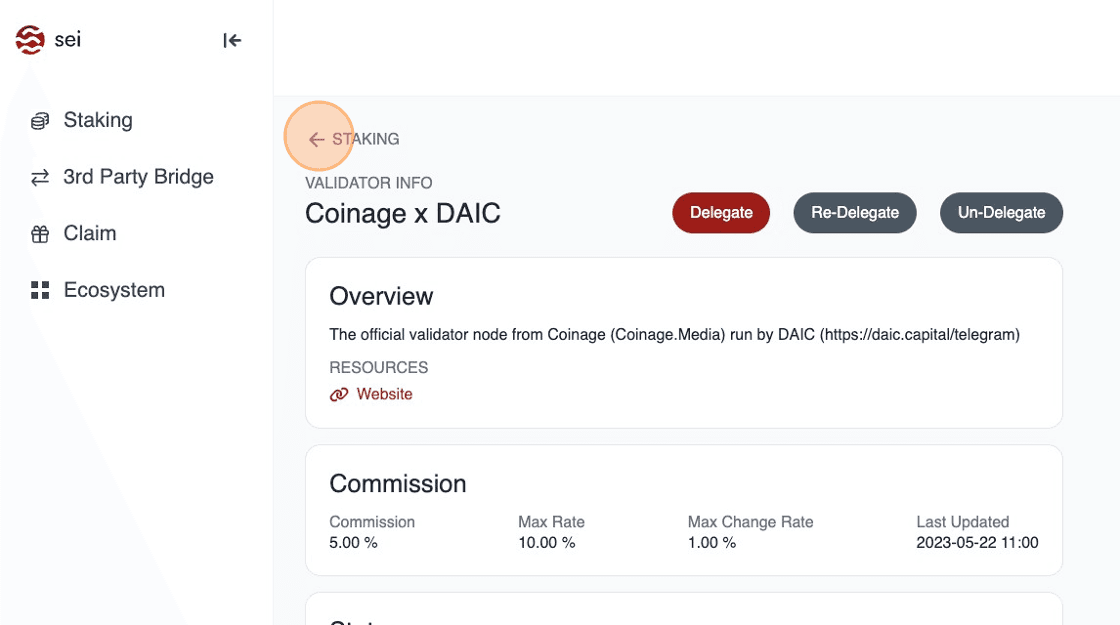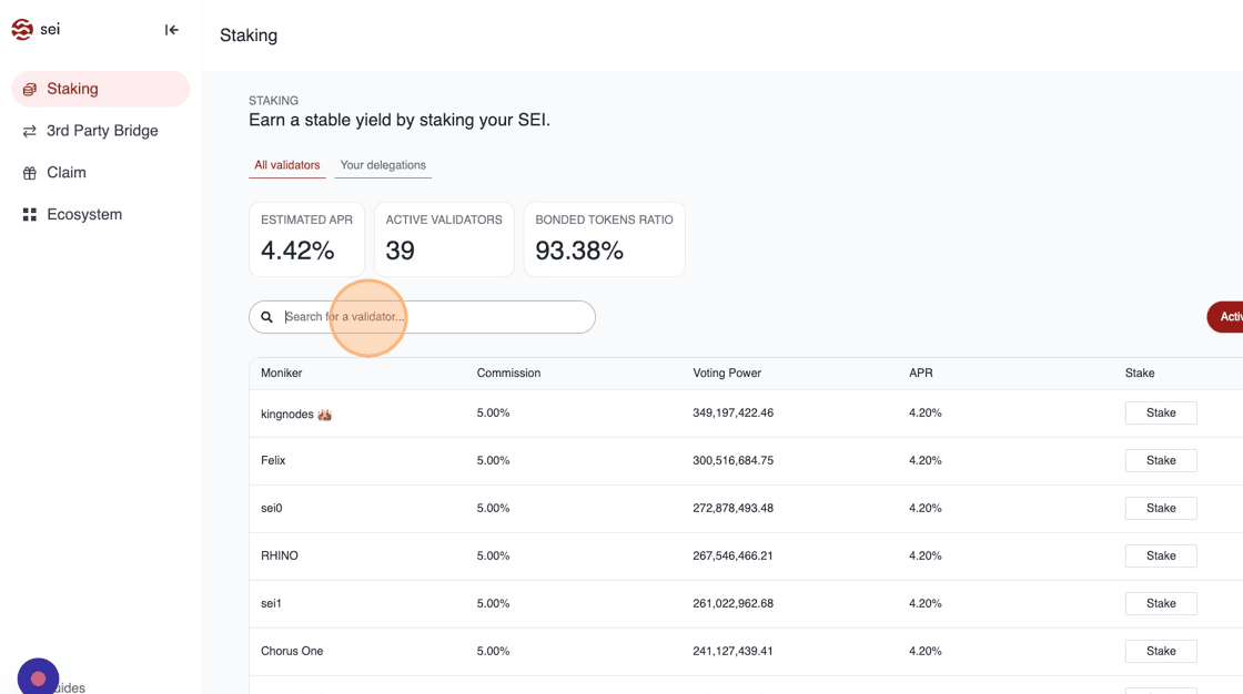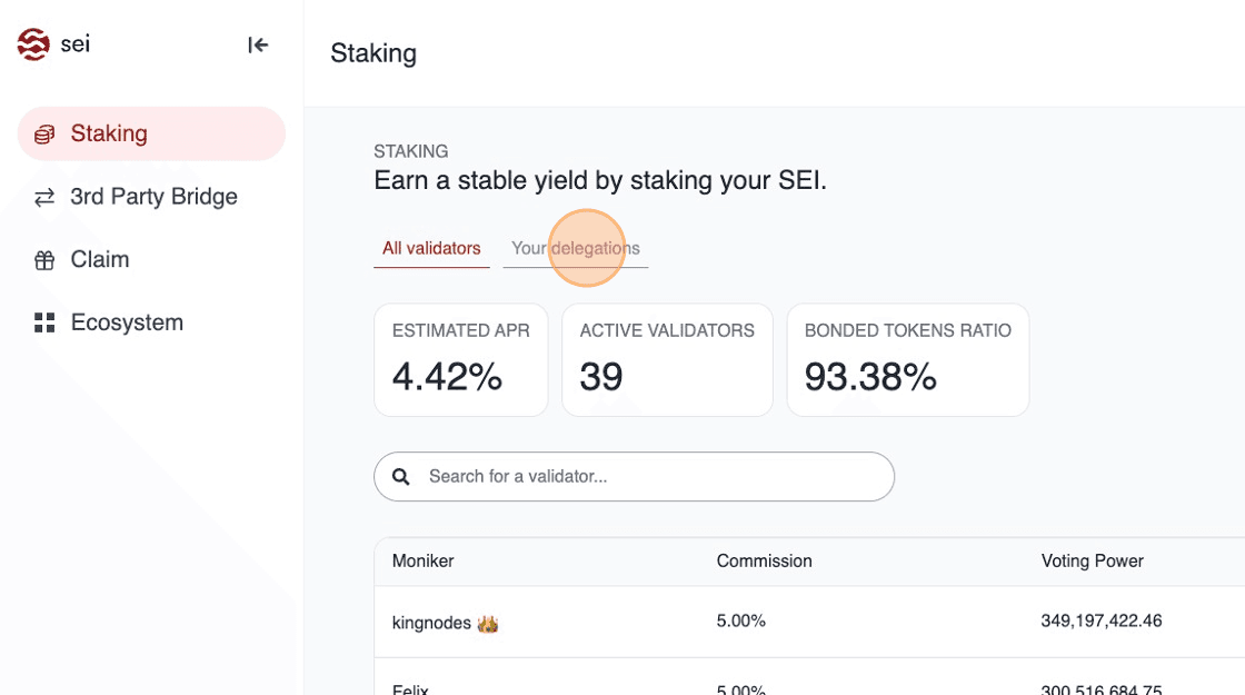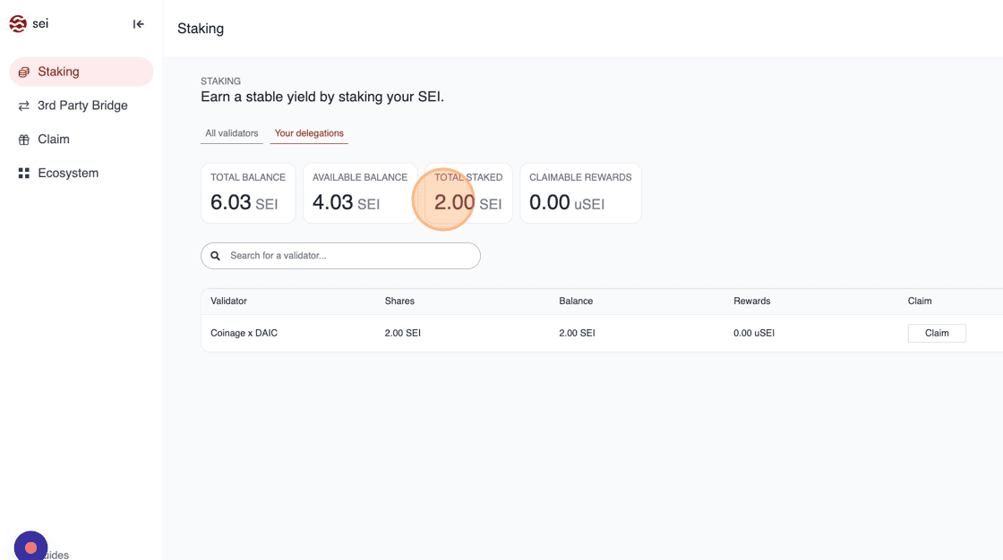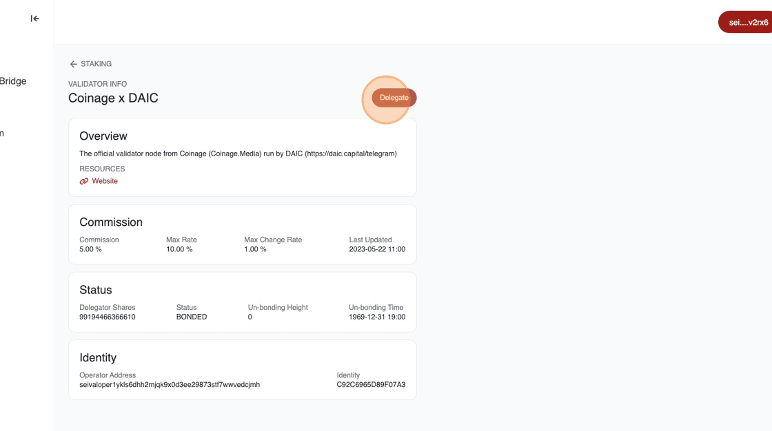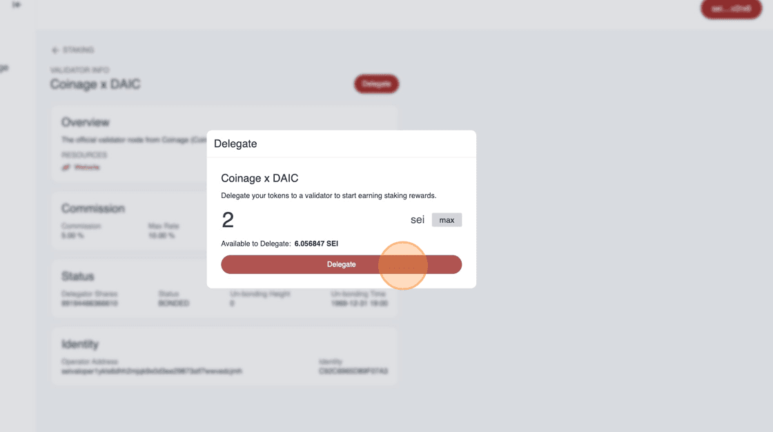 8. Enter the number of SEI tokens you want to stake and Click Delegate