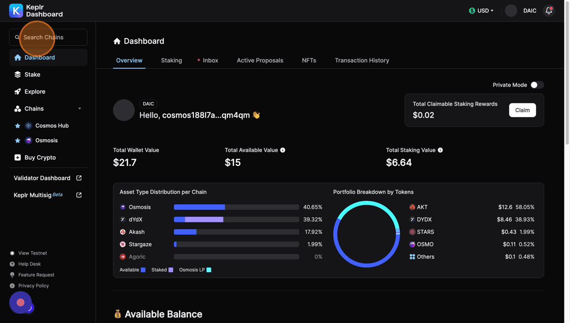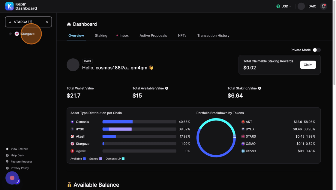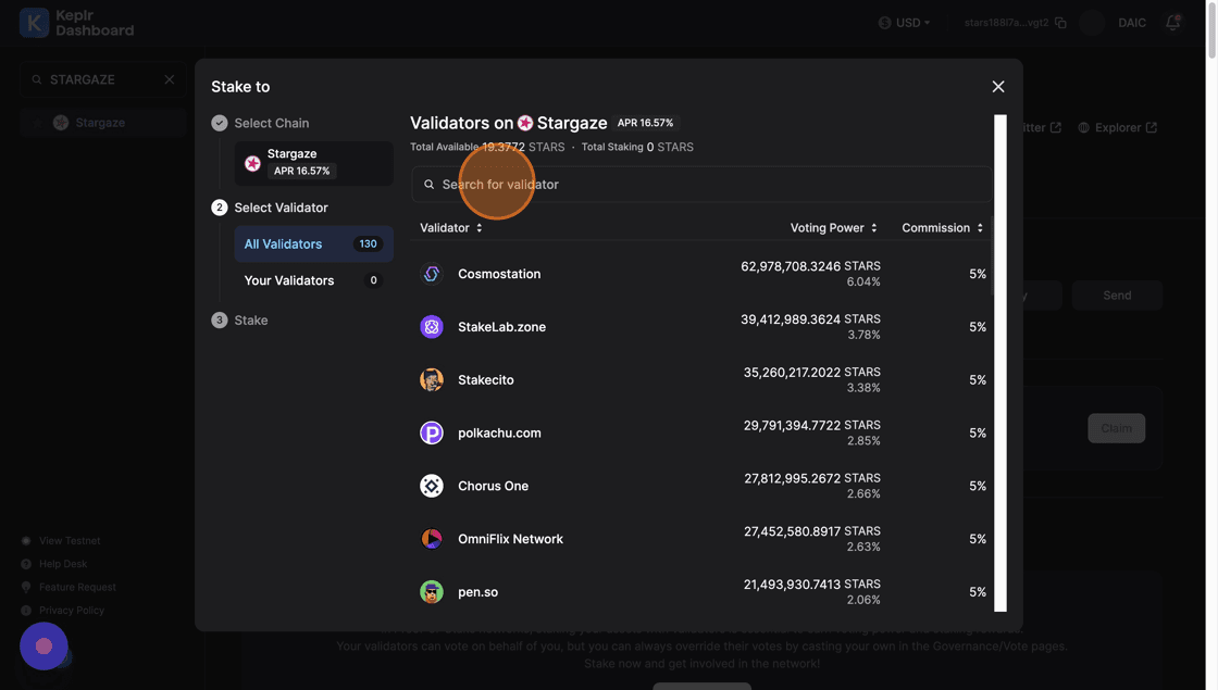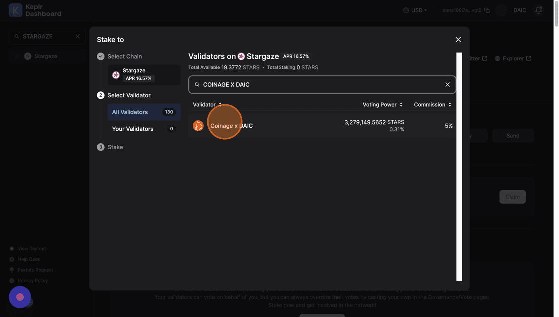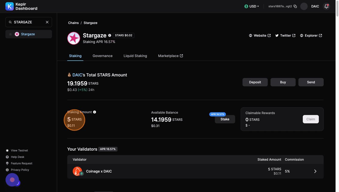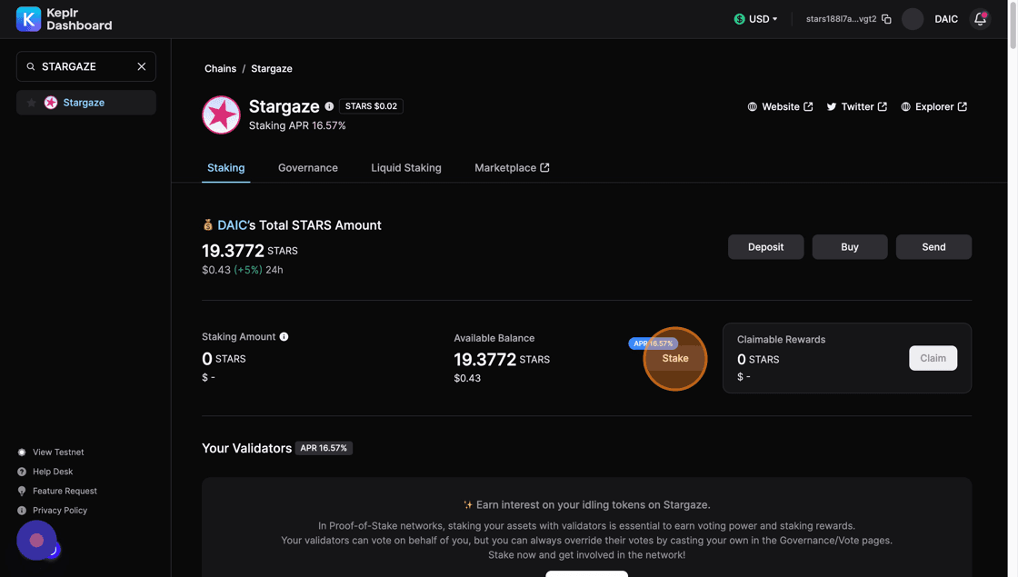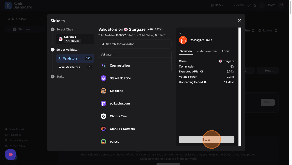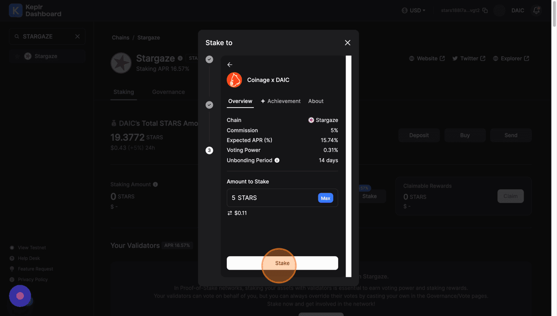 8. Click the Amount field, enter the number of STARS tokens you want to stake and Click Stake
