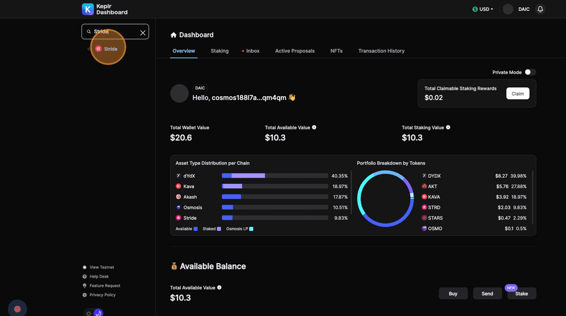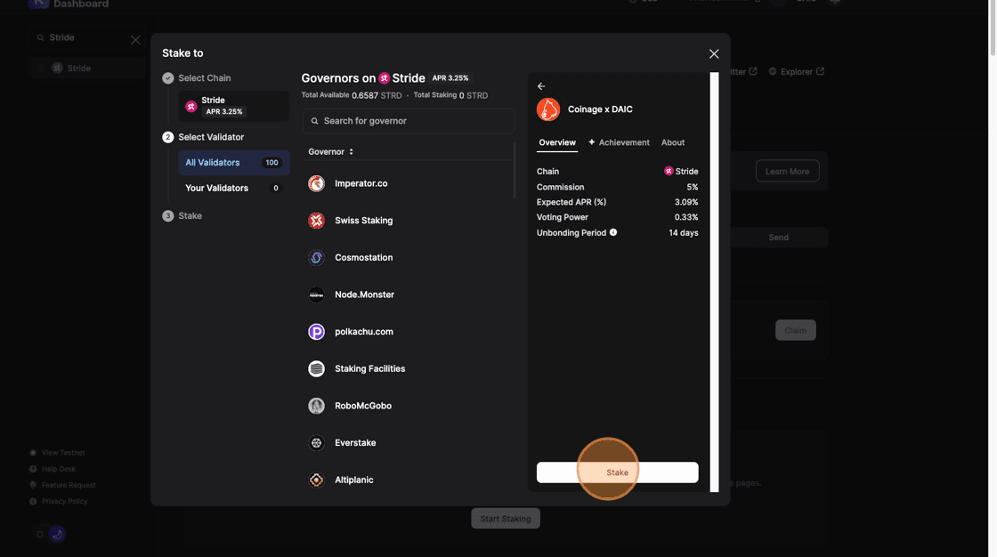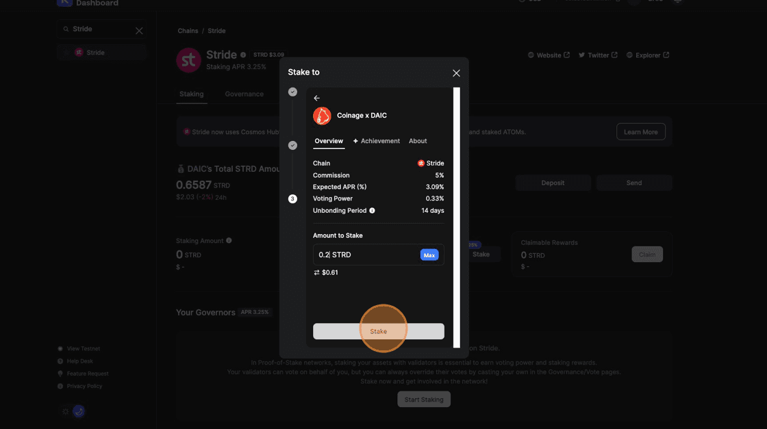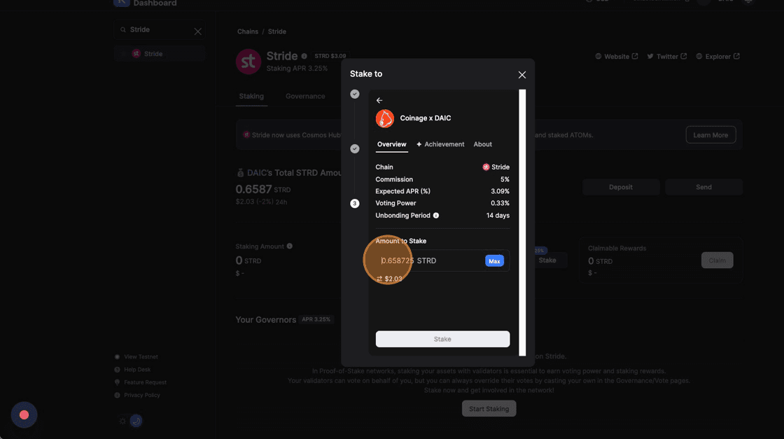 8. Click the Amount field, enter the number of STRD tokens you want to stake
