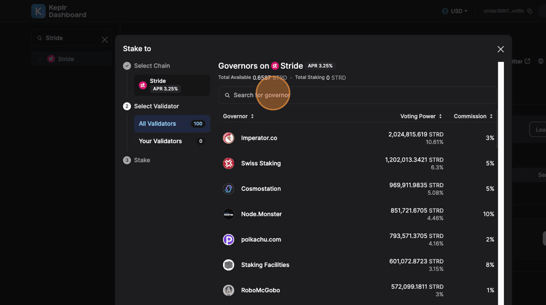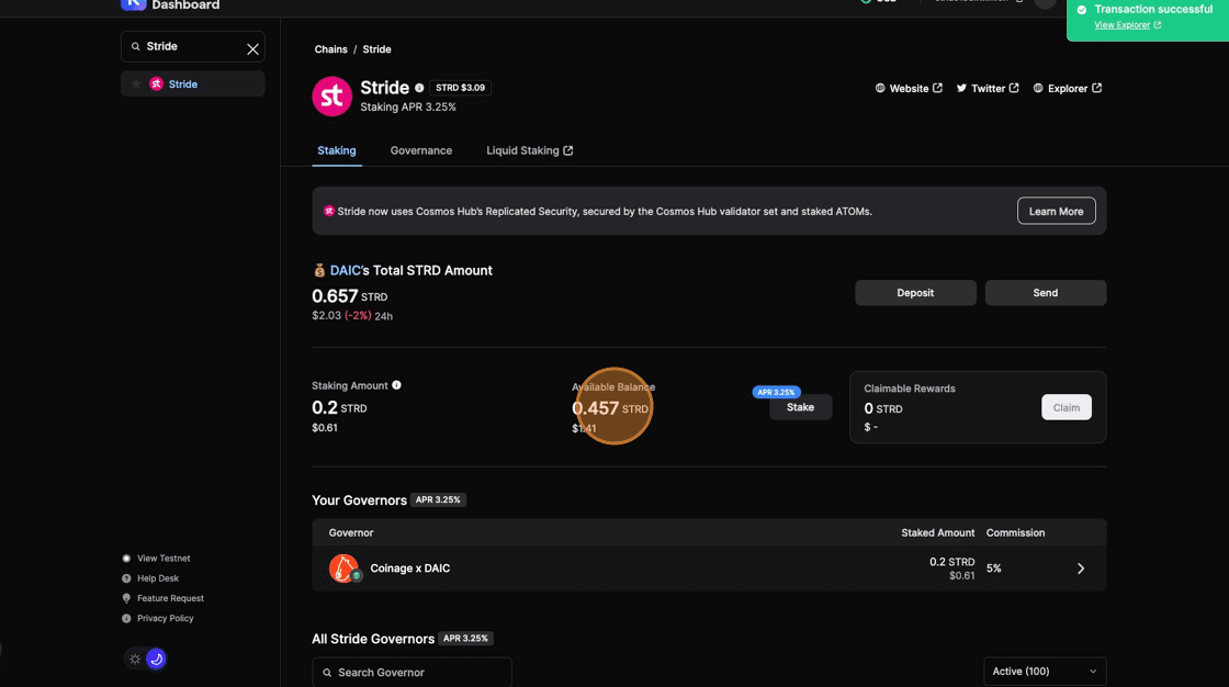 You can start earning staking rewards once your tokens are successfully delegated to a governor
