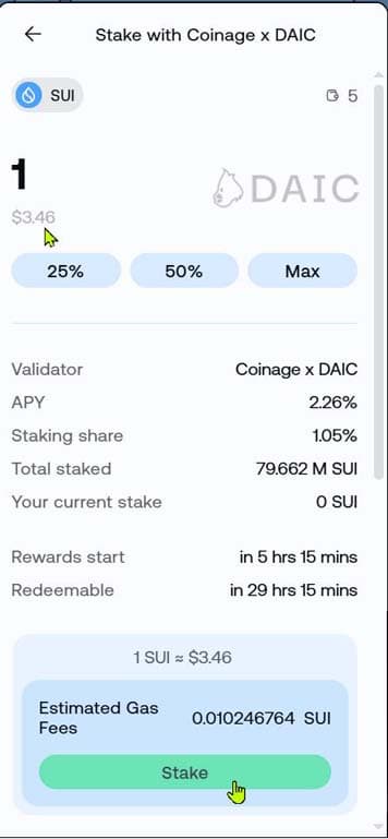5. Enter the amount of SUI tokens and click “Stake” button