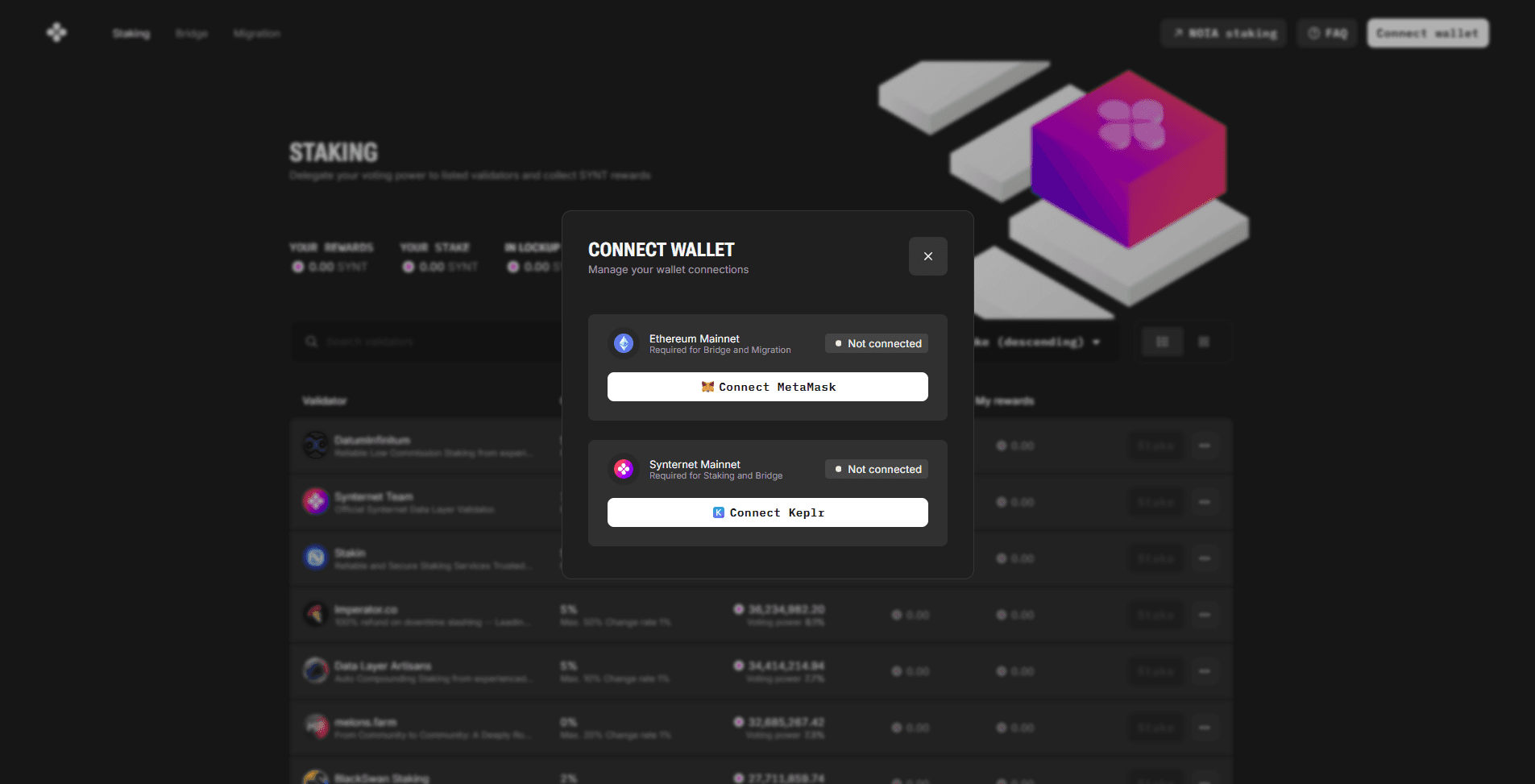 For staking you only need to connecdt your Keplr wallet - if you want to bridge SYNT from Ethereum, you also have to connect your Metamask wallet.