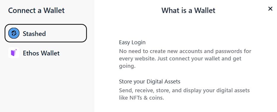 Click and you'll see there are instructions to attach via Stashed or Ethos Wallet, which is probably the same thing you likely saw in that screenshot. Choose the wallet you have set up (either login with Stashed via Google/Twitch or connect your Ethos extension).