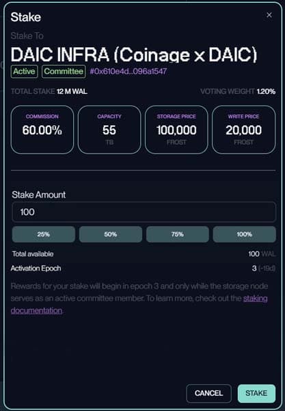 Activation Delay: Your stake doesn't start earning rewards instantly. It needs to become "active," which depends on when you staked during the two-week epoch cycle. To begin earning yield in the next epoch, you must commit your stake in the first half of the current epoch, otherwise, you will not be eligible to earn WAL rewards until after the next epoch.