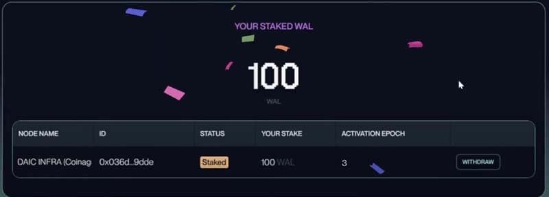 And that's it! Once the transaction confirms on the blockchain, your WAL is officially staked to Coinage x DAIC (or your chosen validator).