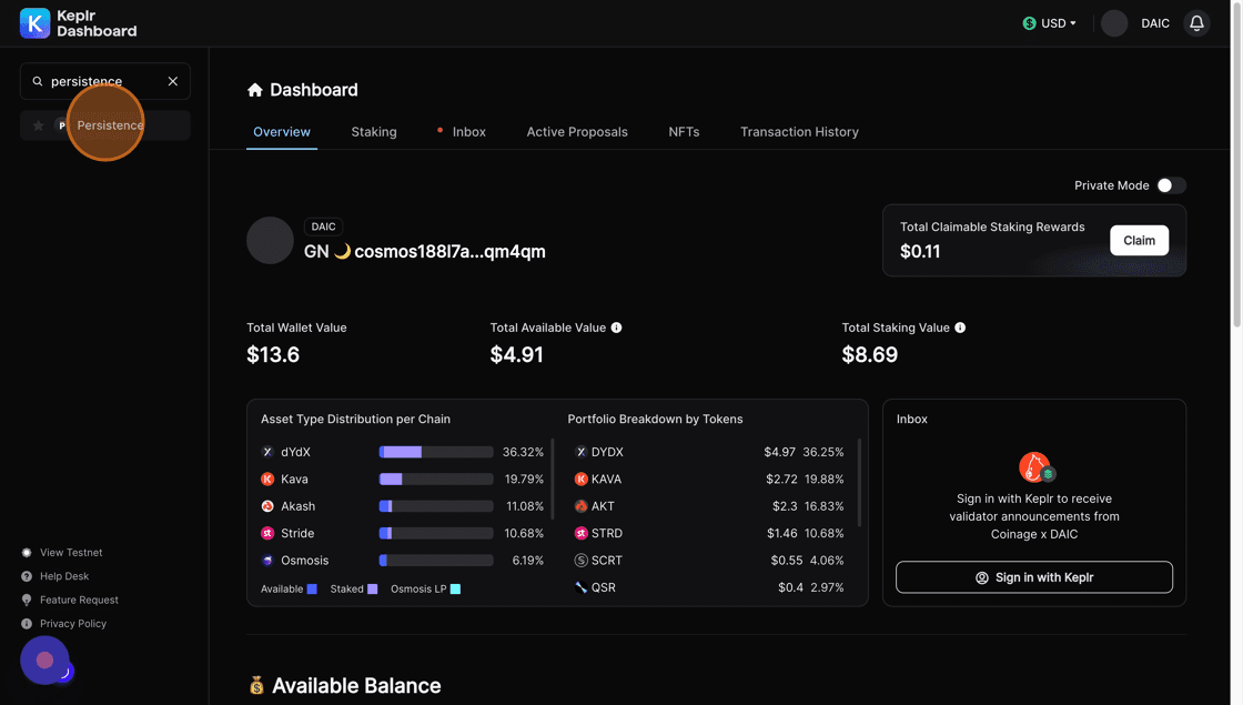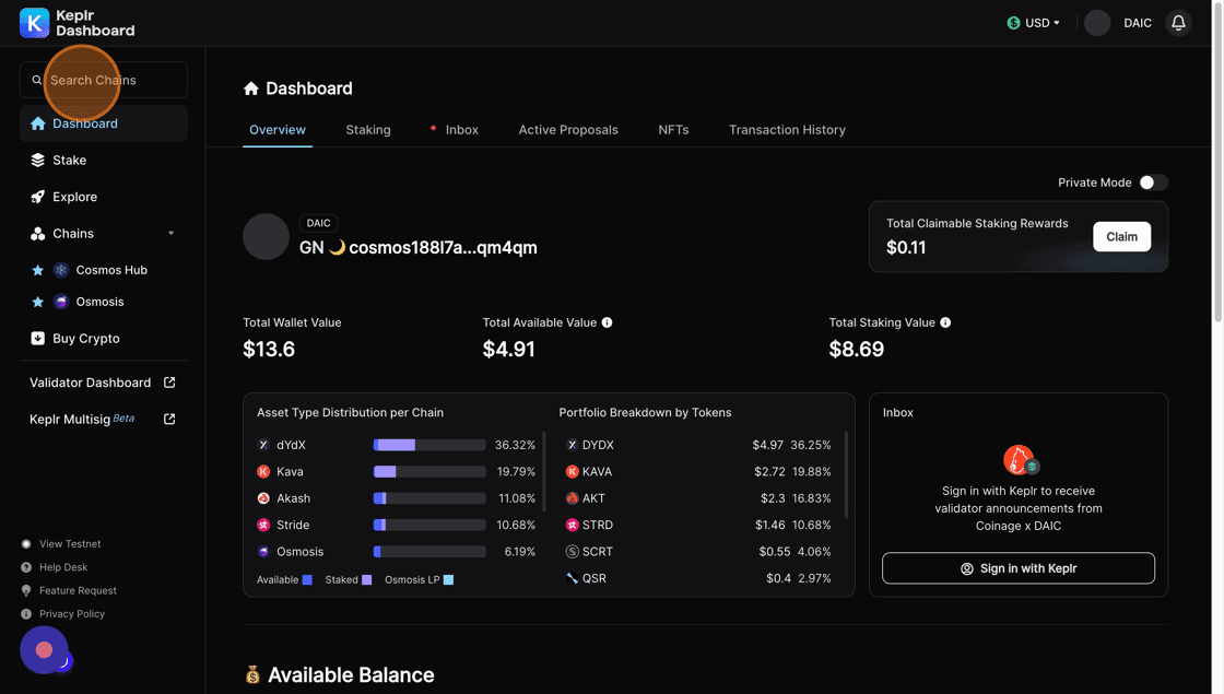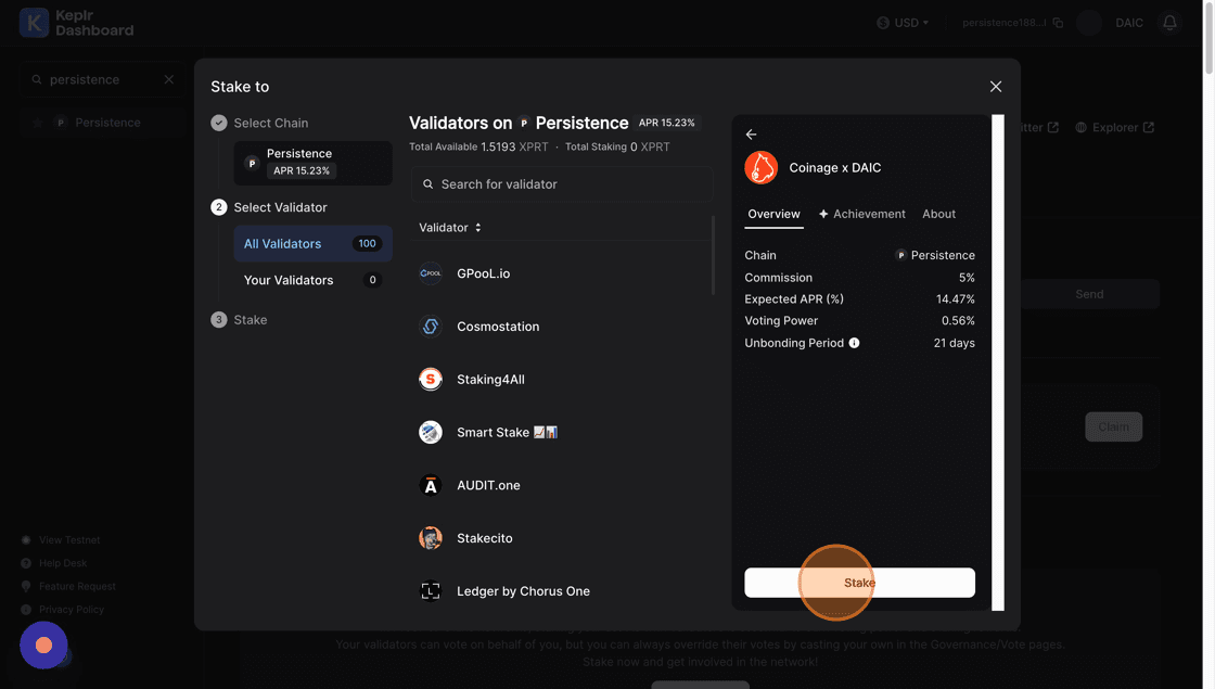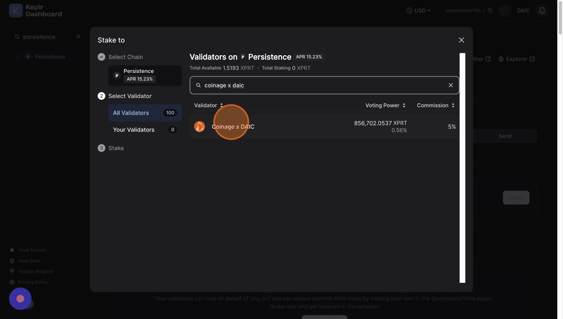 5. Click the Search for validator field and type Coinage x DAIC