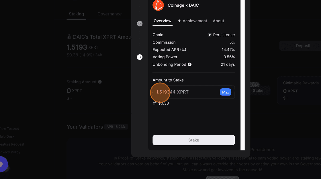 8. Click the Amount field, enter the number of XPRT tokens you want to stake
