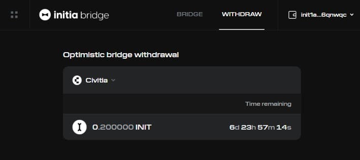 Sending funds to apps using the Bridge function is typically fast and straightforward. The unique considerations arise when moving funds back from an App. As a bit of background, Initia apps (Rollups) based on "optimistic" technology, which involves a security check called a challenge period (usually ~7 days) during standard withdrawals back to the Initia network. Crucially, for users moving funds within Initia, it allows instantly bridging your INIT from an Initia ecosystem apps (Rollups) back to the main Initia L1 using its special fast withdrawal pathway.