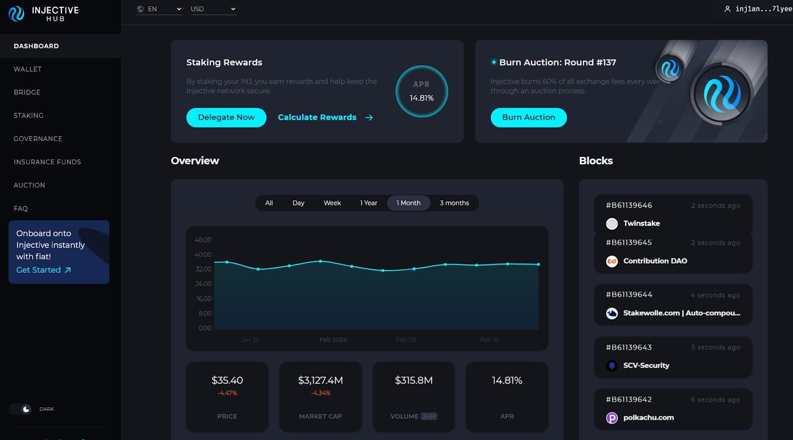 - Staking: Users can stake INJ tokens, the native fuel of the blockchain, to contribute to network security and earn rewards. This fosters ecosystem stability while offering individuals a path to financial gain.