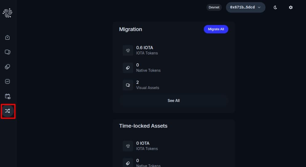 If your wallet contains Stardust assets that need this migration, the IOTA Wallet Dashboard is designed to alert you. After connecting your recovered wallet to IOTA Wallet Dashboard, you'll see a dedicated "Migration" section in the dashboard menu and prominent "Migrate All" button. The tool will show you an overview of your Stardust native NFTs and tokens that are eligible for migration. You can usually drill down to see more details.