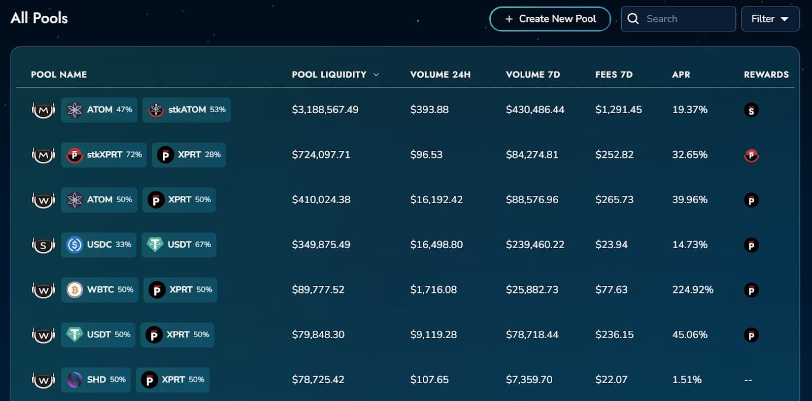 This dual-reward mechanism optimizes capital efficiency and attracts a wider range of users to the platform. As of now, the total APR for providing liquidity in the stkXPRT/XPRT pool stands at an impressive 29.59%.