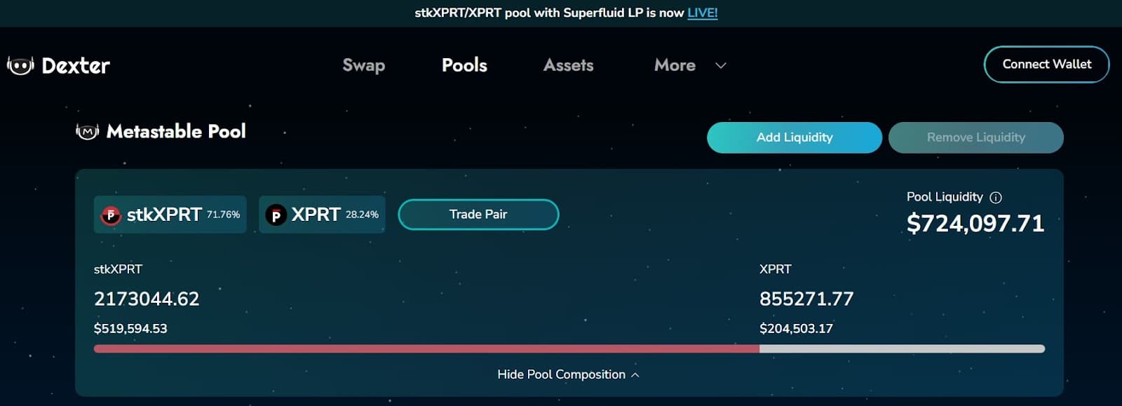 - Liberates Locked Liquidity: While XPRT's high staking ratio is crucial for network security, it traditionally locks up liquidity. stkXPRT unlocks this value by enabling staked XPRT to be utilized in DeFi through the Superfluid LP feature, eliminating the need for unbonding periods.