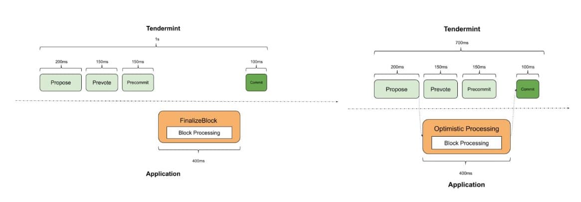 This innovative approach empowers validators to process transactions optimistically upon the reception of a valid block proposal, bypassing the delay until the “Precommit” phase concludes. The rationale behind this strategy lies in the observation that, in most scenarios, the first proposed block at a particular height emerges victorious post-voting. Thus, initiating transaction processing from the outset maximizes the likelihood of capitalizing on this trend.