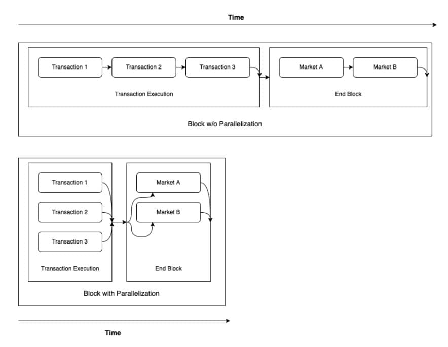 Moreover, Sei implements parallel processing for order execution at the block's conclusion, particularly for independent orders tied to its native order-matching engine. These orders are deemed independent if they involve distinct markets within the same block, with developers empowered to define market dependencies.