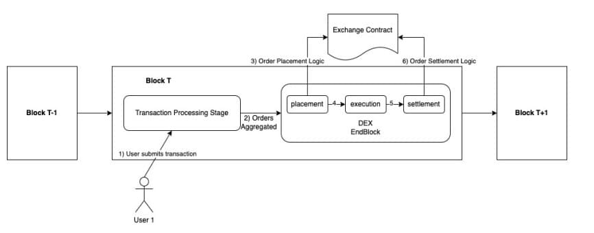 All transactions involving the matching engine will execute atomically within a block's scope. These transactions are directed to the DEX module, with each transaction potentially containing multiple orders. Upon submission, the transaction handler adds the orders from each transaction to the DEX module's internal MemState. During block processing, the DEX module's EndBlocker hook consolidates orders recorded in the MemState in bulk. This consolidation involves aggregating orders by market (e.g., all orders for a BTC perpetual), resulting in a single smart contract call for each specific market.