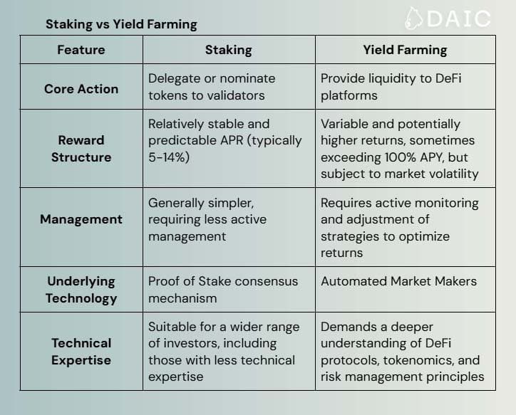 The choice between staking and yield farming depends on the investor's risk tolerance and return requirements. The former is for more conservative investors seeking predictable, low-risk returns. Yield farming offers higher potential gains but requires a much greater risk tolerance and active management.
